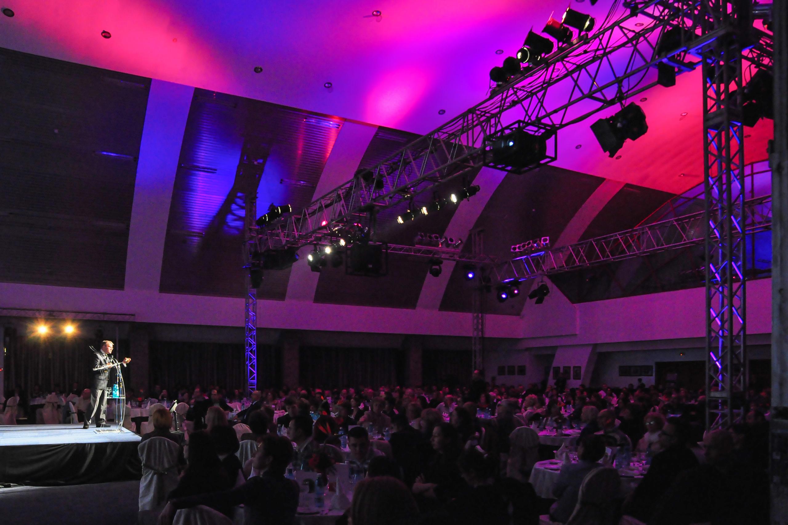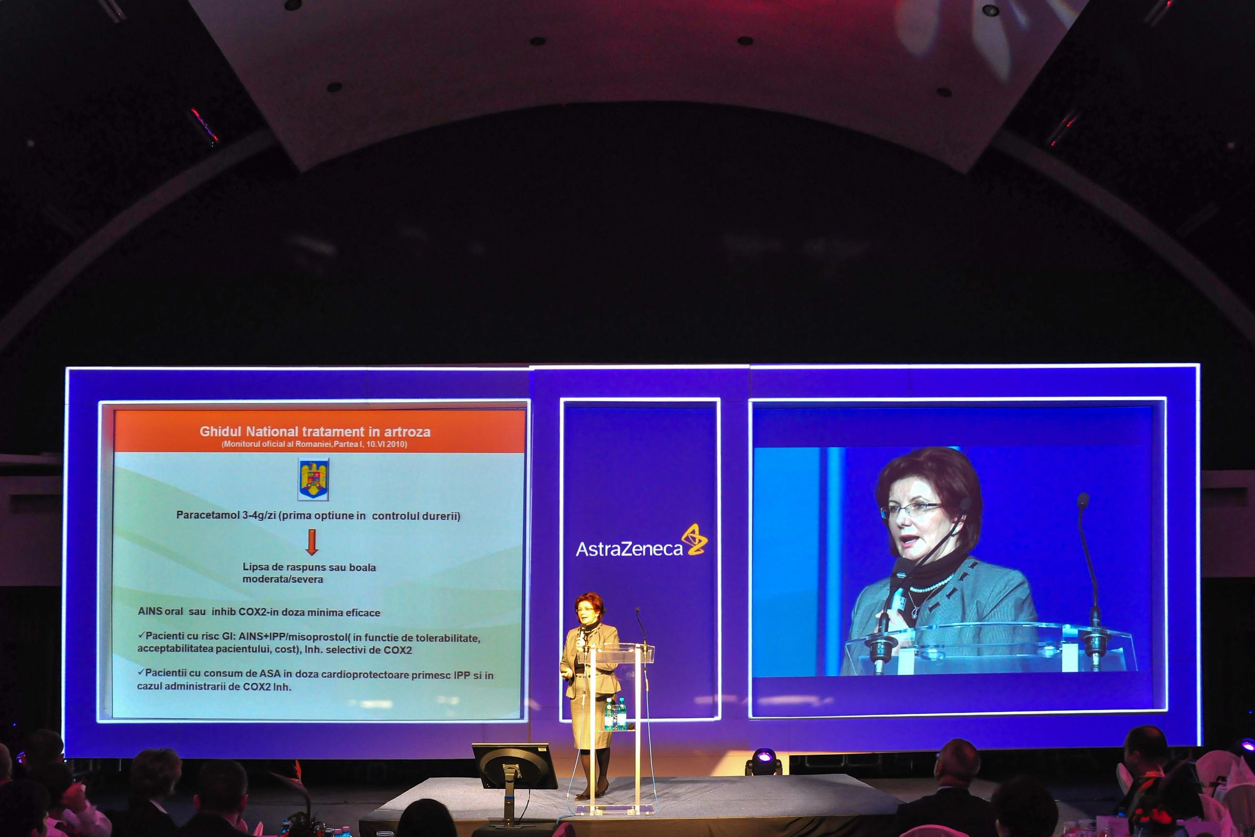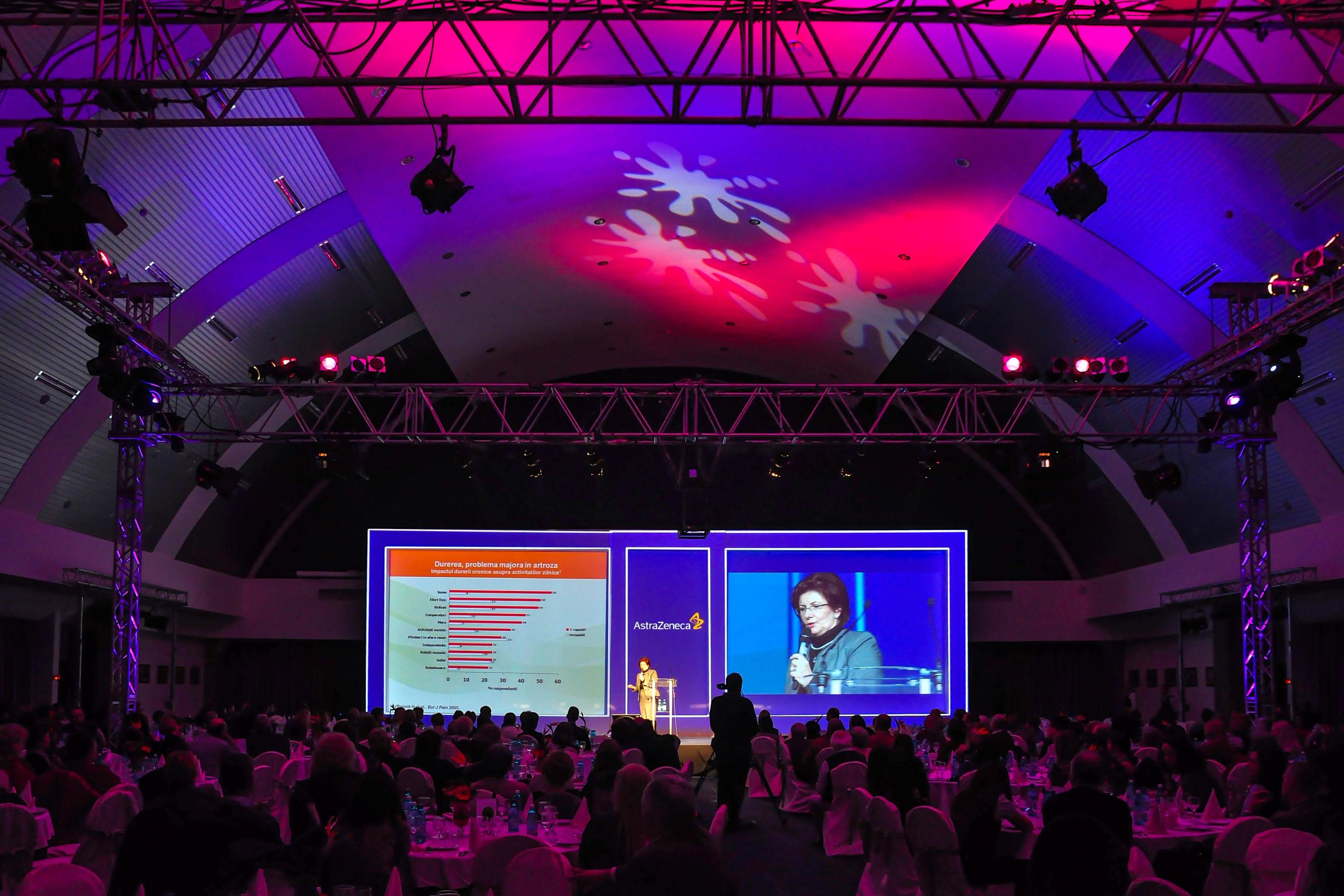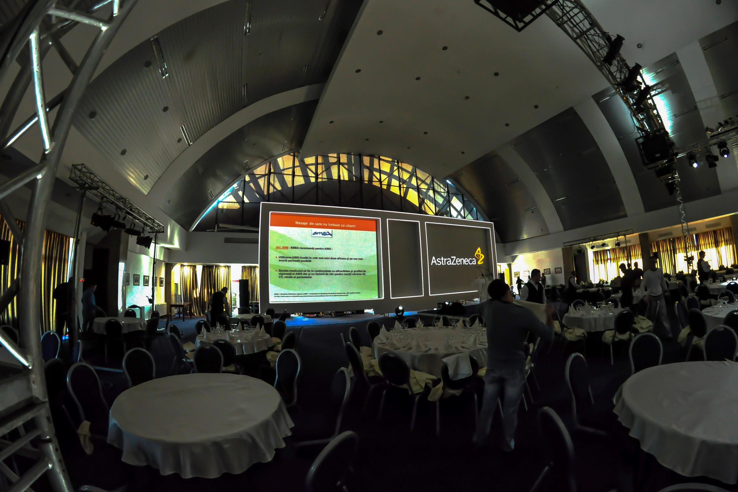 High-resolution video projection on a panoramic screen (media server, edge blending, PiP), along with full audio, lighting, and staging services for an AstraZeneca corporate event at Sala NATO, Poiana Brașov.