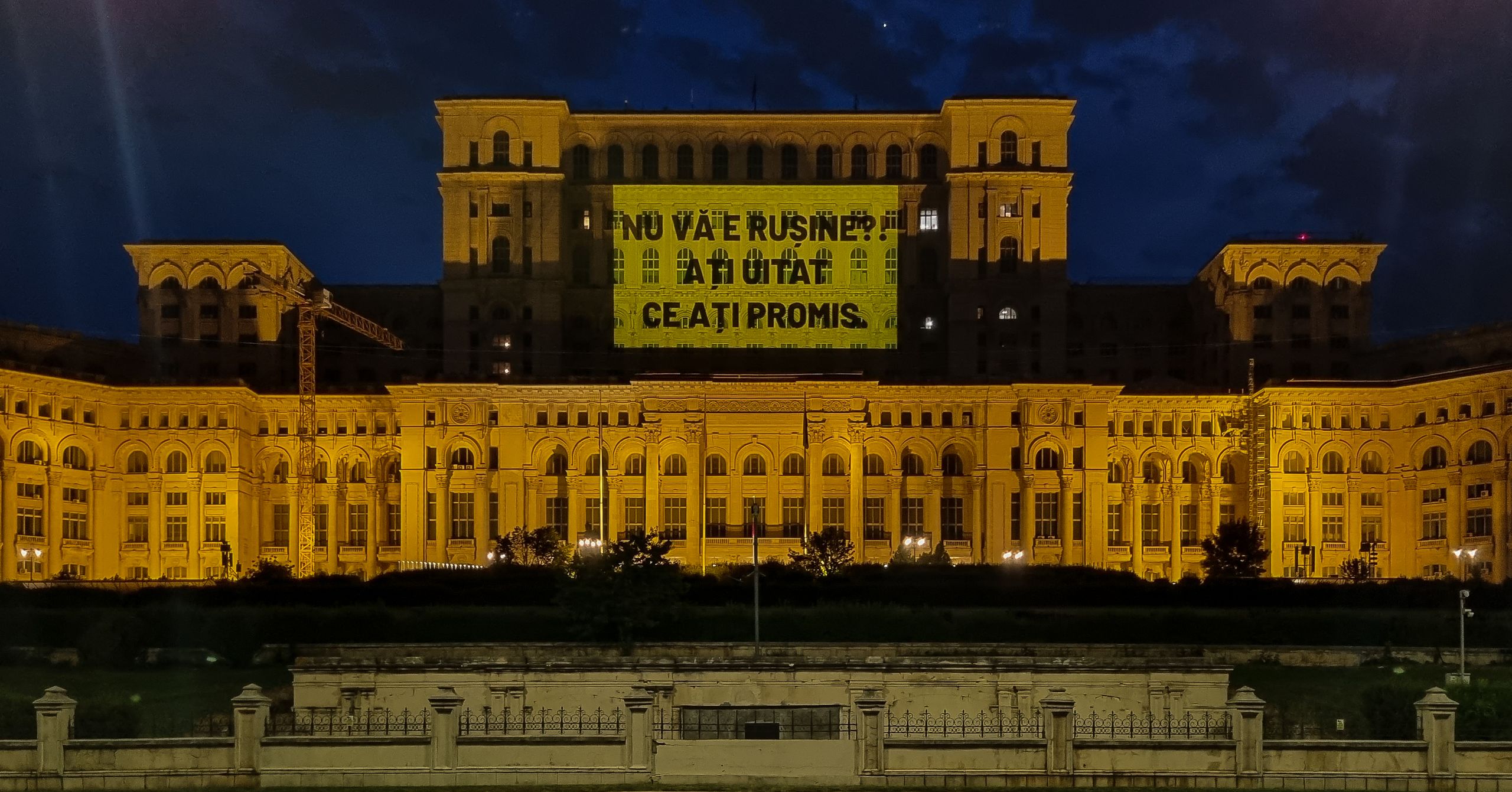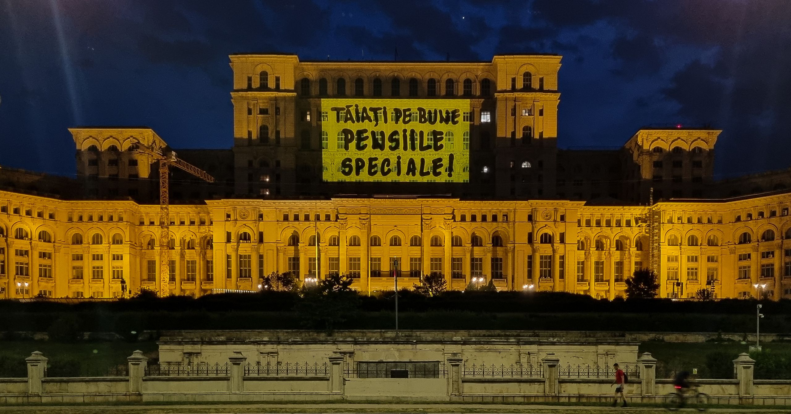 Video projection on the Palace of Parliament during a Delic-led protest against special pensions for MPs—Romania’s largest online campaigning platform calling for political accountability.