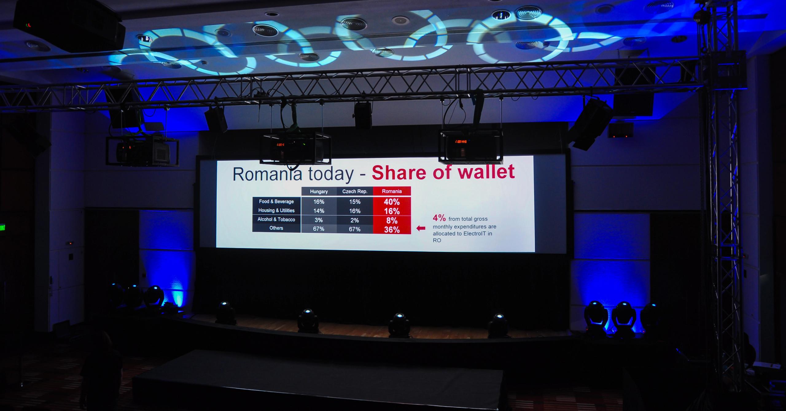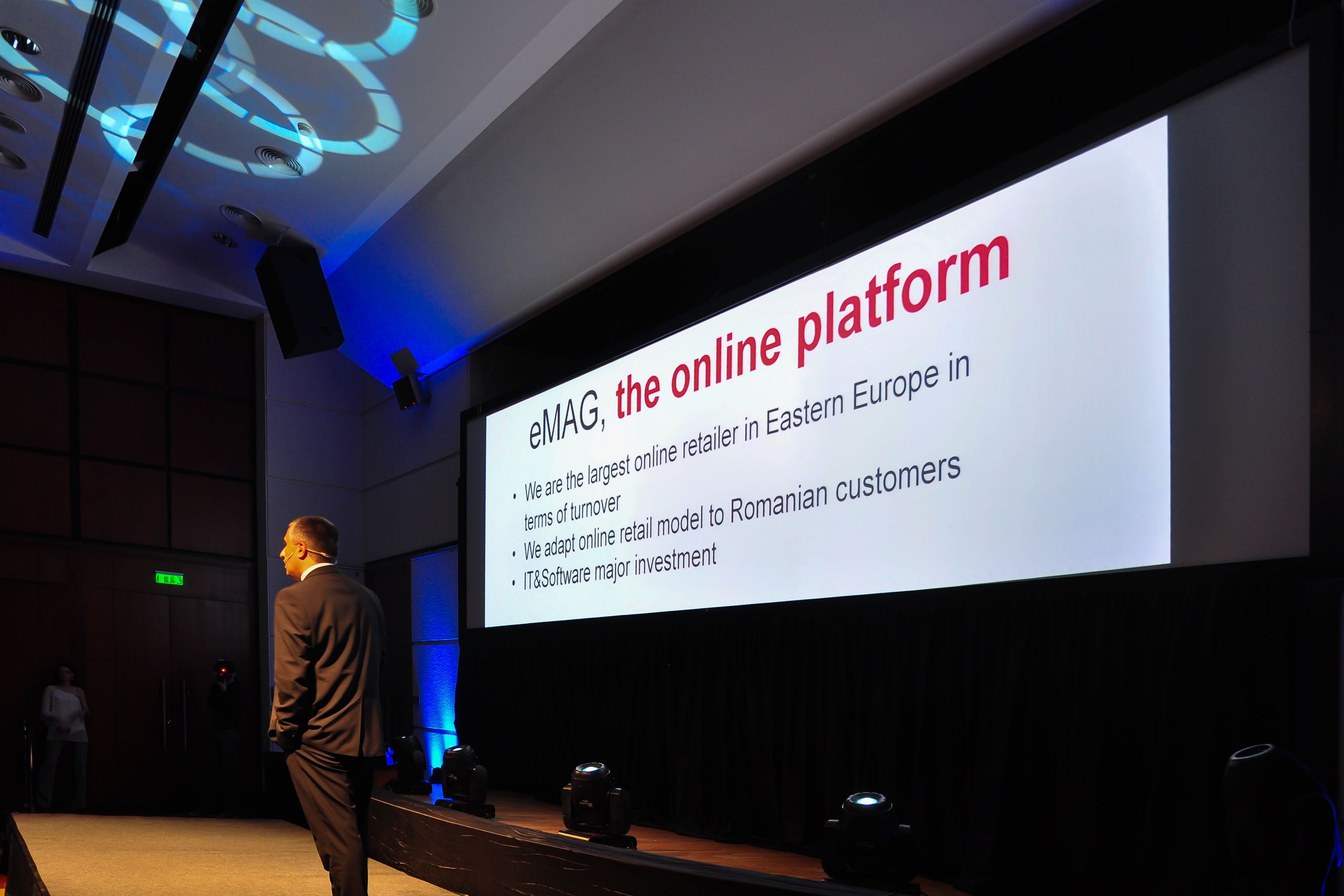 High-resolution panoramic video projection (media server, edge blending, PiP) and full audio, lighting, video, and staging services for a Flanco & eMAG corporate event.