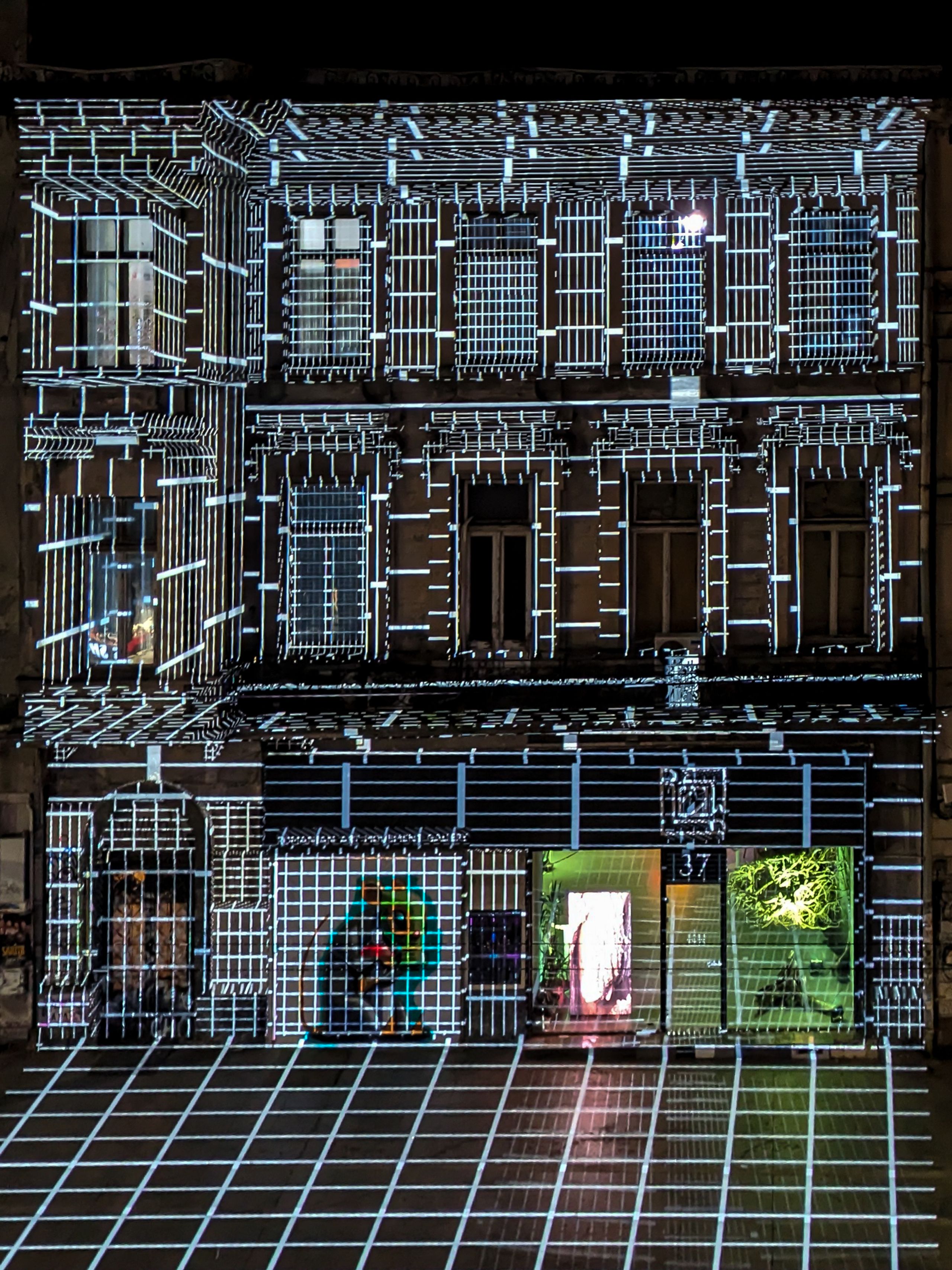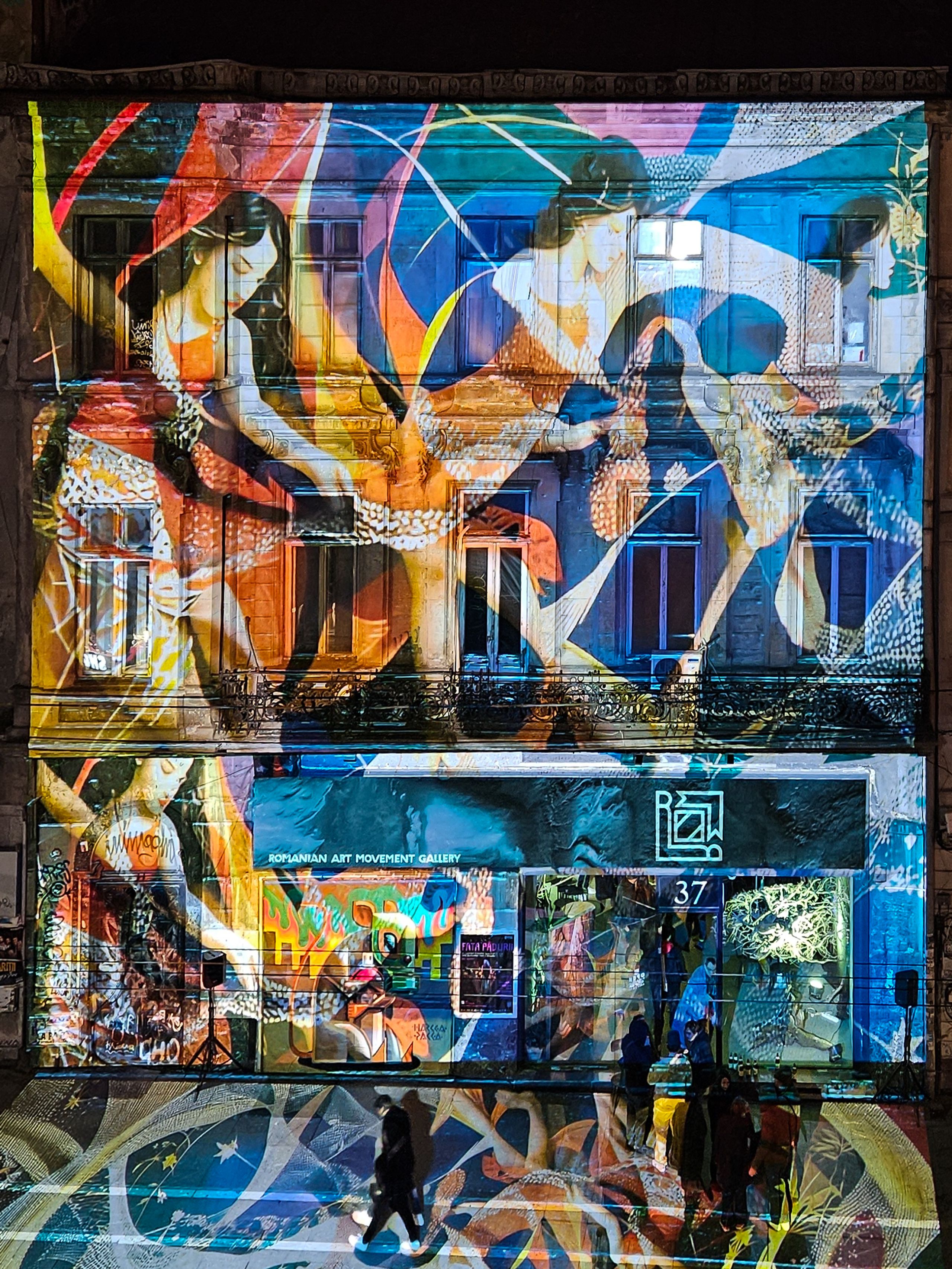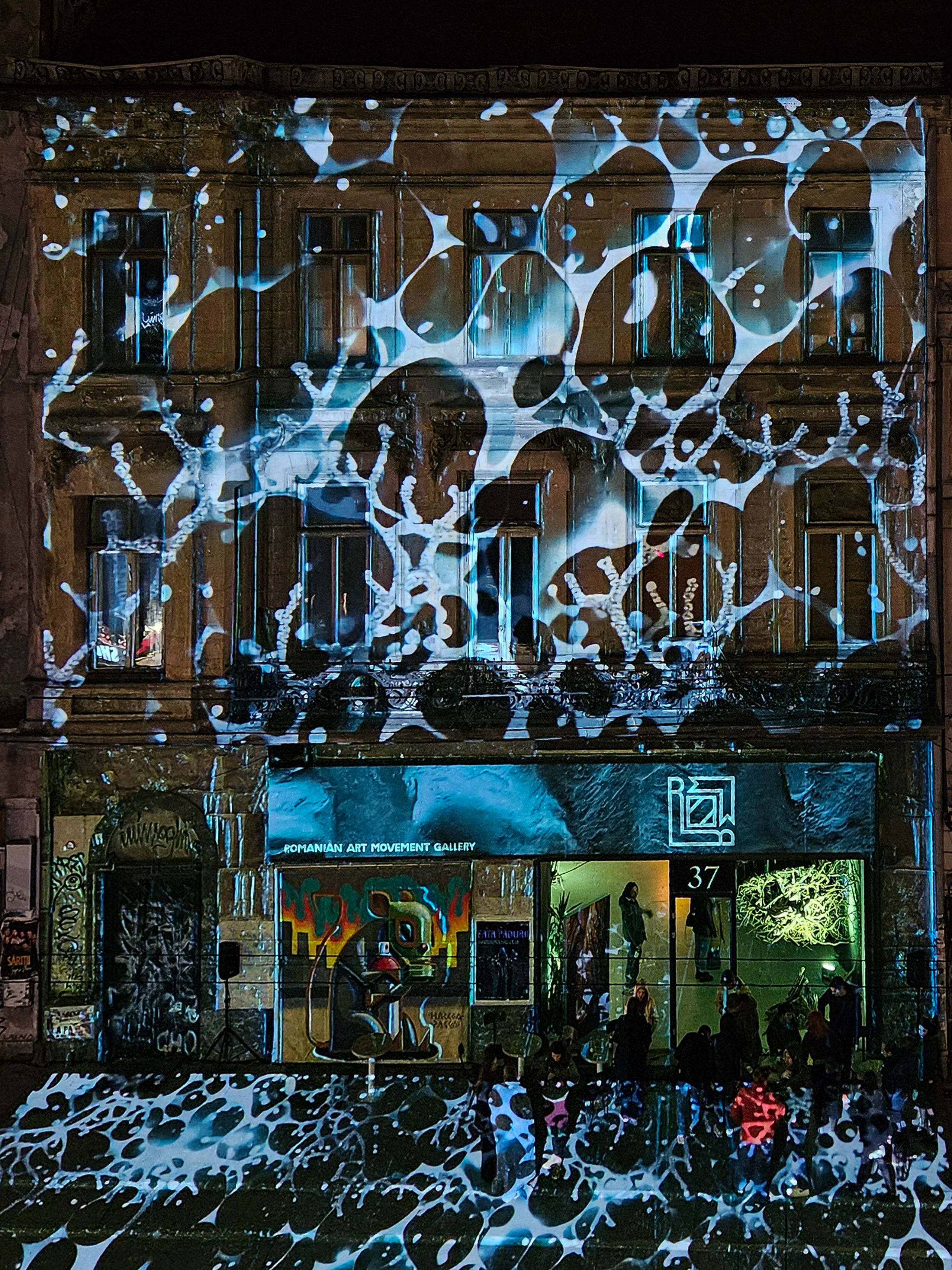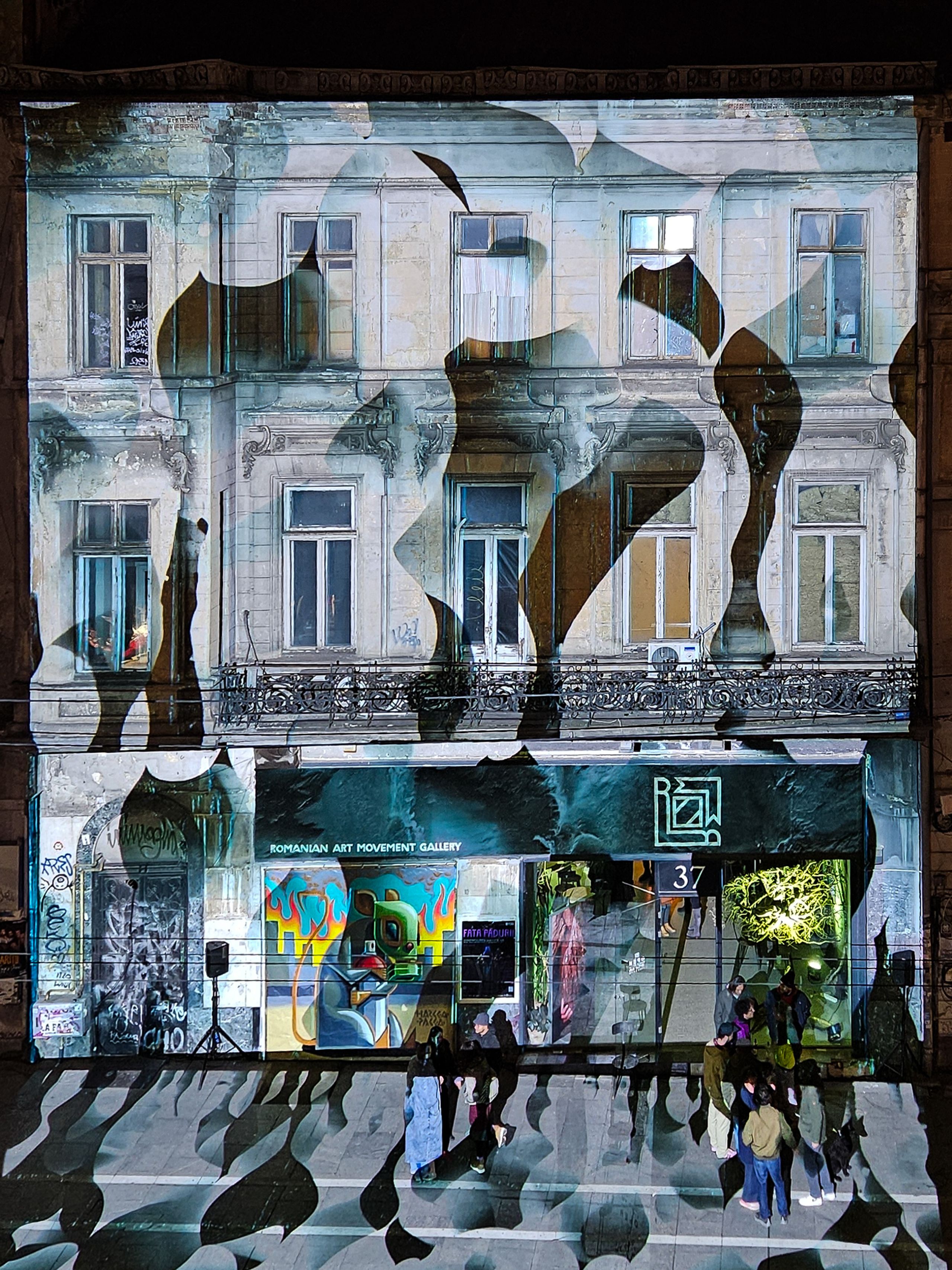 Video mapping on the facade of the Romanian Art Movement Gallery in Bucharest, marking the closing event of the exhibition “Forest Maiden. The Magical Dimension. V1.”